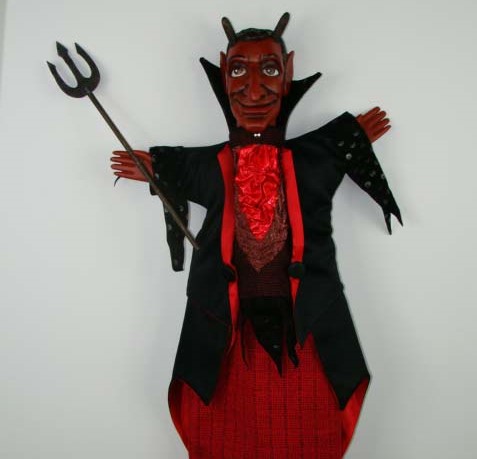 Maňásek Čert má dřevěnou vyřezávanou hlavu a ruce. Lipové dřevo je namalované temperovými barvami. Tělo je ušité z látky.